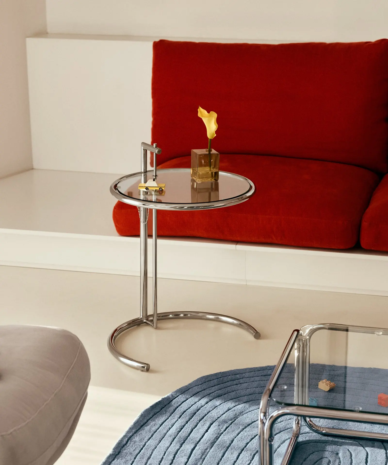 El uso de los materiales de acero cromado combinado con el cristal hace que sea una mesa atemporal y minimalista.